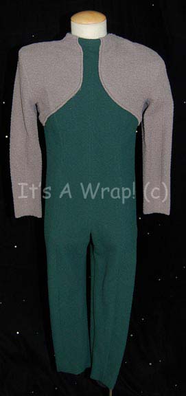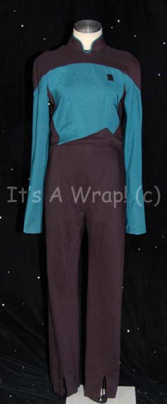 A costume featured in various episodes of Star Trek: Deep Space Nine. This costume is for wear by Cathy DeBuono who was the stand-in, photo and body double for Terry Farrell in seasons 5 and 6 of DS9, a long-sleeved, full-length, black, Starfleet uniform jumpsuit featuring Sciences Blue division colors … |