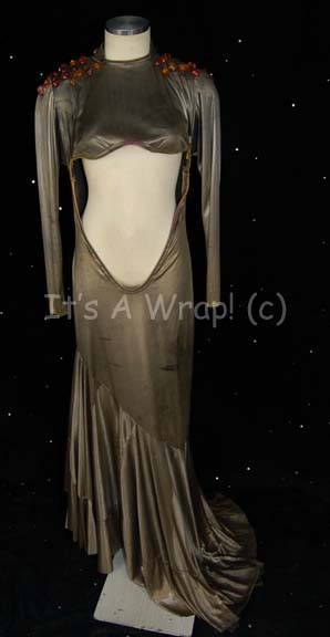 A costume featured in various episodes of Star Trek: Deep Space Nine like “Emissary” or “A Man Alone”. This costume consists of a long, metallic-pewter, moderately transparent dress featuring multi-colored faux jewels across the shoulders, completely open across the abdomen on the front and back, with bra cups only covering … |