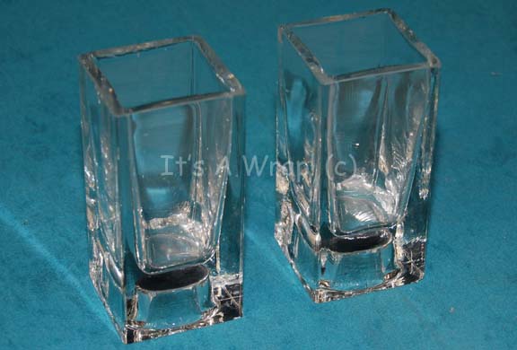 A pair of clear glasses appearing variously in episodes of Star Trek: Deep Space Nine on the set of “Quark’s! Bar”. The items are shorter square shaped glasses with heavy inset bases and were originally intended to be candle holders which were upended for use as drinking vessels on the … |