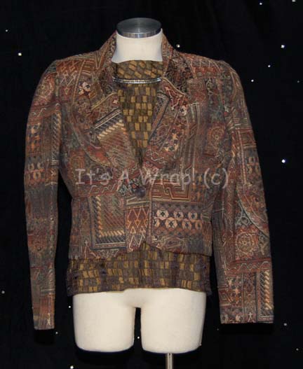 A costume featured in various episodes of Star Trek: Deep Space Nine. This costume is a Bajoran Militia uniform consisting of a long-sleeved, rust-colored jacket featuring a textured, vertical, striped pattern like a wide corduroy, darker colored sleeves with a black-stitched diamond design, a Velcro patch for a commbadge (sold … |