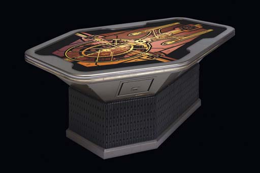 A six-sided wood and acrylic plastic table, large backlit center table panel features a technical diagram of the <I>Starship Enterprise-E</I> in the LCARS style -- <I>37x96x64in.</I> -- featured in the ship's engine room in <I>Star Trek: Insurrection</I> and <I>Star Trek: Nemesis</I> [internal florescent lighting fixtures untested] |