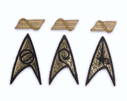 Three <I>Original Series</I>-style <I>Enterprise</I> arrowhead "vector" emblems with two bands one command one sciences [unused] and one Engineering, several smaller pieces of cuff braid and one length of gold trim -- all made for "Trials and Tribble-ations" in <I>Star Trek: Deep Space Nine</I>, except for the gold trim, which was … |