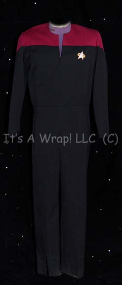 A Starfleet uniform featured in Star Trek VII: Generations for wear by Patrick Stewart in his portrayal of “Captain Picard”. The costume is a black uniform jumpsuit with command red shoulders, an elastic interior waist, a zip front, and a sewn in tag reading ‘Patrick Stewart’, and a plum colored … |