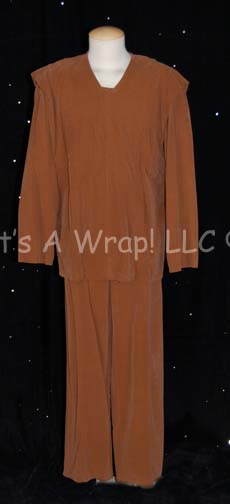A costume featured in the Star Trek: Voyager two episode story arc “Workforce”; wherein most of the crew of “Voyager” are kidnapped, altered, brainwashed and put to work on huge industrial work force. This costume was worn by a “Med. Tech.” and includes a brown, suede shirt that zips at … |