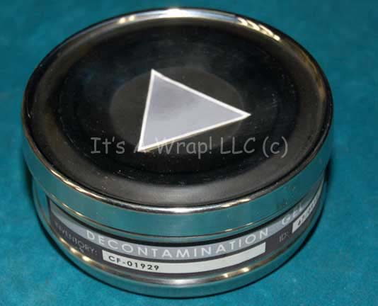 A polished metal container like those appearing in various episodes of Star Trek: Enterprise like “Broken Bow” as decontamination gel. The item is a lidded container with multiple graphical applications adhered externally, two of them actually reading ‘decontamination gel’ and a triangular application on the lid. Opening the item reveals … |