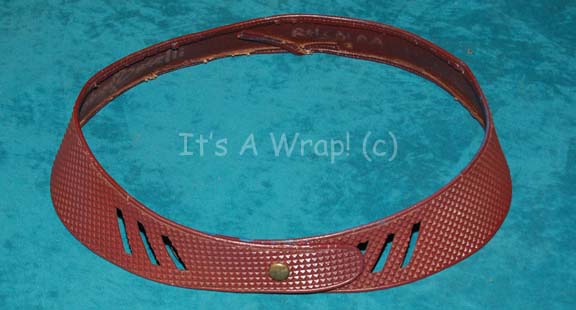 A large sized Bajoran officer’s costume belt like those appearing in episodes of Star Trek: Deep Space Nine. The item is maroon colored vinyl with multiple snap positions for size and triple cutouts on flanking the snap for decoration. The interior of the belt is inscribed and the item measures … |