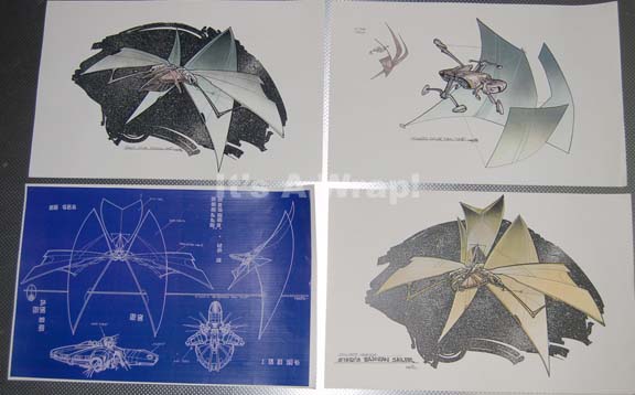A lot of four white paper duplicates depicting various concepts sketches of “Captain Siskos’” (Avery Brooks) Bajoran solar sailing ship from the Star Trek: Deep Space Nine episode “Explorers”. The lot contains three color copy sketches of possible ships and one ‘blueprint’ style rendering with Bajoran typography. The three sketches … |