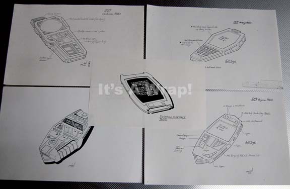 A lot of five paper photocopies created for episodes of Star Trek: Deep Space Nine. The lot contains four 11.5 X 17 inch sheets of white paper with duplicated detailed drawings on them and one 8.5 X 11 inch sheet. The drawings include a ‘Ferengi contract PADD’, ‘Bajoran PADD’, ‘Ferengi … |