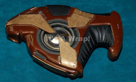 A prop item like those featured in the Star Trek: Deep Space Nine episode “The Circle” for use by members of the titular group in their coup against the Bajoran provisional government. This item is a sturdy resin cast, brown with bronze-colored, raised accents, black detail on the ‘barrel’, evidence … |
