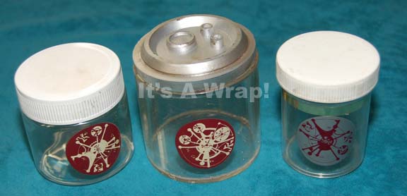 A lot of three clear set dressing jars made with Cardassian graphical applications believed to have appeared in the Infirmary set in episodes of Star Trek: Deep Space Nine. Two of the items are ‘found’ props, functional plastic jars with white screw lid caps, the third is a clear acrylic … |