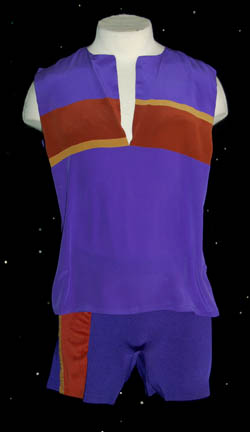The purple chiffon swimsuit and shirt with a tan and brown stripe worn by Avery Brooks while portraying “Commander Sisko” in the pilot movie episode of Star Trek: Deep Space Nine, “Emissary”. Making the best of his new assignment, Sisko receives a gift that allows him to contact the gods … |