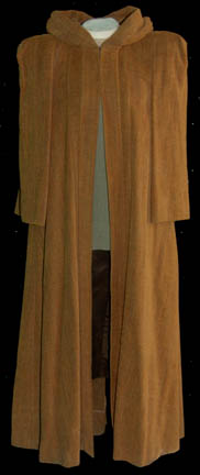 Played by Kellie Waymire, this costume was worn by “Lanya” in the Star Trek: Voyager episode “Muse”. It consists of a cream colored over robe with a hood and tie at the neck with a stitched together multi-pieced metal corset painted gold on the outside with a pair of affixed … |