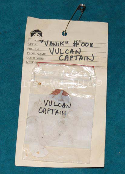 A prop rank badge with costumer’s labeling created for the Star Trek: Enterprise episode “Breaking the Ice”. The item is a copper colored molded resin badge with a metallic silver flair in the center that was located in a plastic zip bag inscribed ‘Vulcan Captain’ which was stapled to a … |