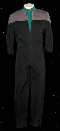 An operations gold division uniform featured in Star Trek X: Nemesis for wear by the extremely confident “Young Ensign” (Nicholas Lanier) who installed the new captain's chair with a seat belt in a deleted scene. The costume is a full length black jumpsuit with a zip up the front, sewn … |