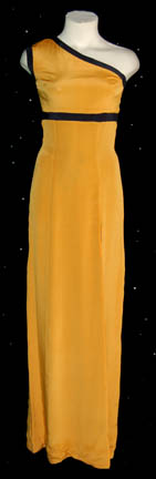 An off the shoulder gold/yellow dress with a black stripe under the bust and a sexy thigh length split up the left leg featured in the Star Trek: Voyager episode “Favorite Son”. Comes complete with a costumer's tag indicating wear by ‘Stacy Hawkens’. |