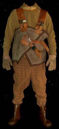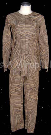 A costume featured in the Star Trek: Voyager episode “Repression”; wherein “Commander Tuvok” (Tim Russ) investigates recent murders of former Maquis on board. This costume consists of a long-sleeved, green shirt featuring a reflective, vertical dash and circular pattern, beige trousers with diamond shaped cuffs and a brown sleeveless robe … |