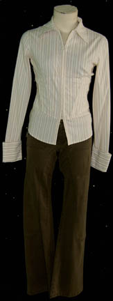 A costume featured in the Star Trek: Enterprise episode “Carpenter Street”, wherein “Captain Archer” (Scott Bakula) and “T'Pol (Jolene Blalock) travel back to the early 21st century to stop a group of Xindi-Reptilians. This costume is for wear by Jolene Blalock in the role of Vulcan science officer on the … |