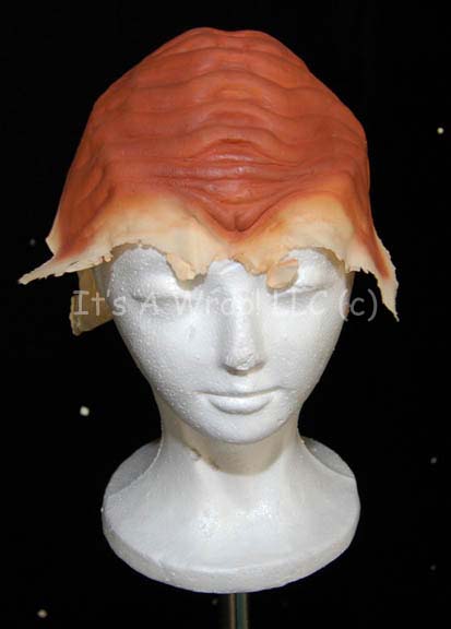 A latex appliance similar to those featured variously in Star Trek episodic television and feature films. The item is off-white latex painted in a rust color featuring the Klingon forehead design and fitting over the entire top of the head. Item has one small spot of discoloration. |