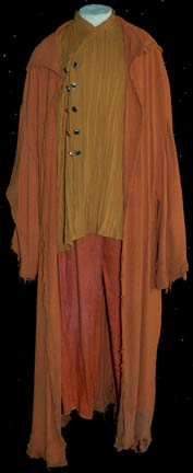 A stunt costume featured in Star Trek: Deep Space Nine for wear by “Rom” (Dennis Madalone). The costume is a brown colored sleeveless jumpsuit with a multi-colored long sleeved shirt, and an olive and orange striped jacket with a gold colored metal broach in the center of the chest. The … |