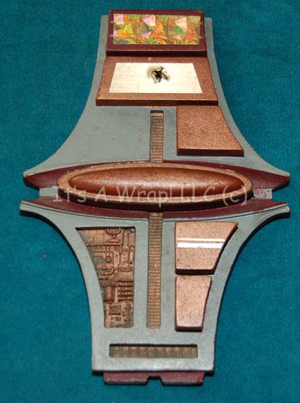 This fabulous console dome is made of vacuum formed opaque plastic with a black square base most likely to be Ferengi. Black matte paint has been applied to sections of the dome to create the basis of the design and simulate controls. Metallic blue, red and gold strips have been … |
