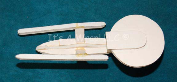 A white foam core fashioned camera test model miniature of a Cardassian Galor-Class ship like those appearing in various episodes of Star Trek: Deep Space Nine and Star trek: The Next Generation. The item is composed of multiple pieces of fashioned white foam core adhered to one another. The item … |