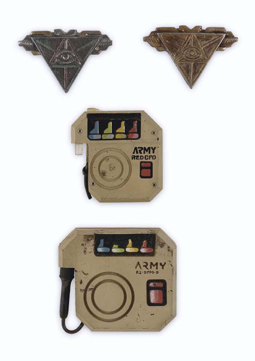Two cast metal "illuminati"-style badges with wire fasteners and two nonfunctional prop "drug dispensers" -- all made for Q's 21st-century military uniforms in "Encounter at Farpoint" in <I>Star Trek: The Next Generation</I> (4) |