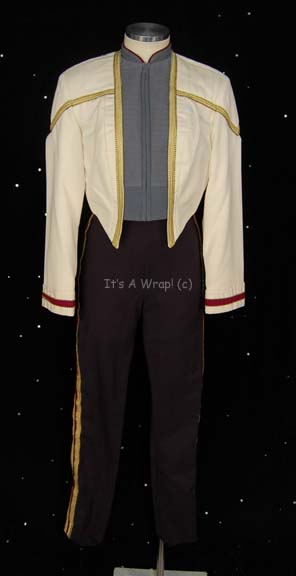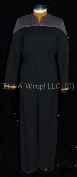 A costume of the style first appearing in Star Trek IX: Insurrection, later Star Trek: Deep Space Nine, and finally during the wedding scenes in Star Trek X: Nemesis. This costume is the new style Starfleet dress uniform consisting of a full-length, sleeveless, black jumpsuit with black and gold-colored braiding … |