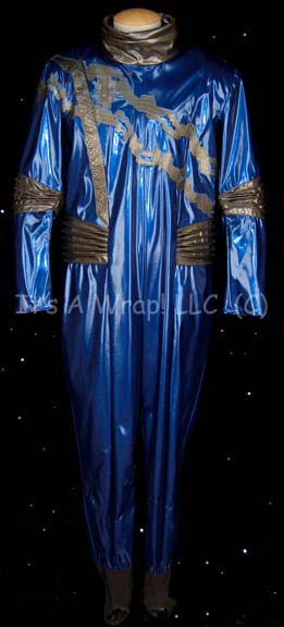A costume featured in the Star Trek: Voyager episode “Drive”; wherein “Tom Paris” (Robert Duncan McNeill) enters the new Delta Flyer in the “Antarian Trans-Stellar Rally”. This costume consists of a long-sleeved, full-length, soft, blue vinyl jumpsuit featuring a gray vinyl, oversized collar, further gray, vinyl accents with a faux … |