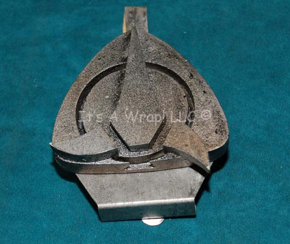 A molded resin badge made to represent a Klingon trefoil design, an emblem of the Empire appearing in the Star Trek: Deep Space Nine episode “Apocalypse Rising” for wear by “Damar” (Casey Biggs). The item features a molded metal clip backing that is wide to fit on his Cardassian uniform … |