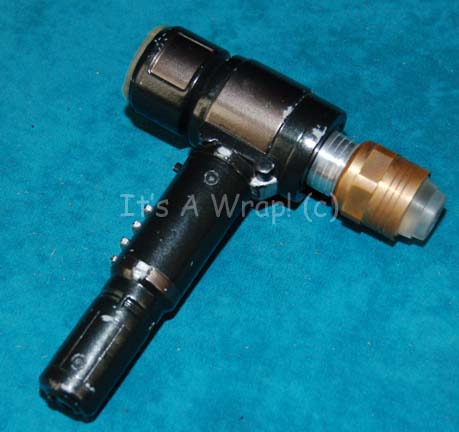| (Paramount, 1983 & 1987-94) This highly detailed pistol phaser is constructed of resin painted silver-blue, with attached hand-held phaser I at the top of the frame painted black with decal buttons and power level. The phaser was later modified with a suede-wrapped handgrip, and used on TNG. A great pistol … |
