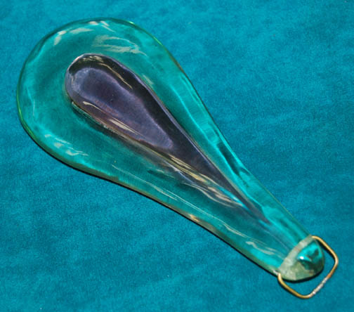 This simple resin pendant is shaped like a beautiful dewdrop, colored opaque green with a raised opaque pink center. It is believed to have appeared in various Star Trek feature films as an accent to the costumes. Measures approx. 5 ½ x 2 ½ inches. |