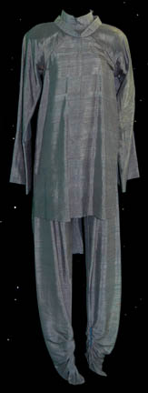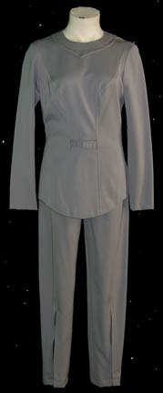 A gray colored Class-A Starfleet uniform featured in Star Trek I: The Motion Picture. The costume is gray trousers with unattached shoes and a matching long sleeved top with an unattached plastic bio monitor. The costume is intended for female wearers. |