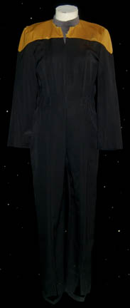 A distressed operations gold female Starfleet uniform jumpsuit made for various episodes of Star Trek: Voyager. This costume is black with gold shoulders and a gray long sleeved undershirt. The distress is evident in that there are tears and minor thrashing around the collar and on the shoulders and around … |