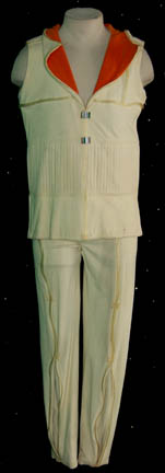 A costume worn in a scene from Star Trek I: The Motion Picture where "Commander Spock" (Leonard Nimoy) is in sickbay after attempting to mindmeld with the alien probe "V'ger". The costume is an off-white, sleeveless, hooded shirt featuring plastic piping down the front, along the trim, and orange fabric … |