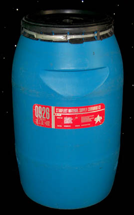 A blue plastic cargo drum with a black plastic lid and a metal seal appearing in various Star Trek episodes. The item is empty and features a red graphical application on the exterior an inventory application labeling the item as categorized by Starfleet Material Supply Command. The application features multiple … |
