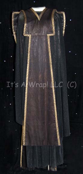 A female Vulcan costume featured in Star Trek IV: The Voyage Home. The costume is a gold colored gown with form fitting long sleeves that is covered by a sparkling black gauzy over gown that is light and airy. The costume also features a thick full length tabard with gold … |