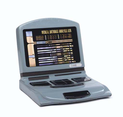 A simulated desktop computer monitor, blue-grey case, nonfunctional lighting circuit would illuminate a backlit graphic transparancy to create a simulated computer image on the screen, included acrylic plastic insert for graphic, graphic reads <I>Medical database analysis</I> -- <I>12½x11½x11½in.</I> -- used as set dressing in the Doctor's sickbay office in <I>Star … |