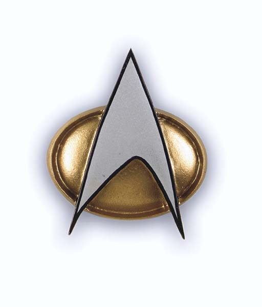 A prop <I>The Next Generation</I>-style Starfleet communicator badge made from cast resin, painted metallic gold and silver with black trim and Velcro backing -- believed to have been made for <I>Star Trek: The Next Generation</I> |