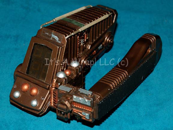A prop hand scanner believed to have been created for use in episodes of Star Trek: Voyager like “Body and Soul”. The item is a molded resin device with a hand grip and a sensor piece adorned with metal linings. The item is painted metallic copper with multiple raised features … |