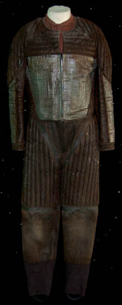 A brown colored Class-D uniform jumpsuit featured in Star Trek I: The Motion Picture. The costume features an affixed plastic bio-monitor, orange science division strips attached to the shoulders, and an affixed Earthbase shoulder patch on the left sleeve depicting the solar system. |