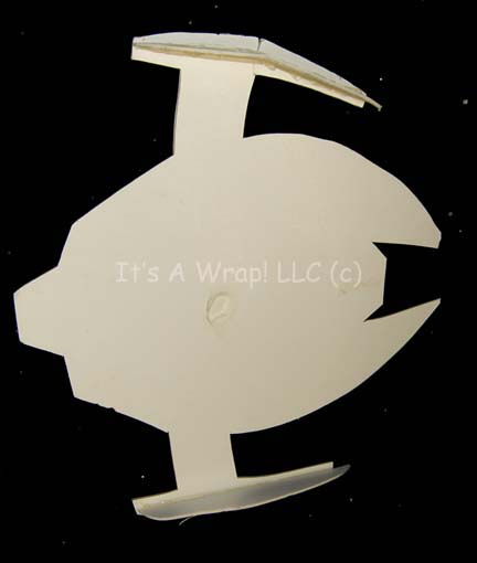 A white foam core camera test model created for use on episodes of Star Trek: Deep Space Nine. The item depicts the underside of a Jem’Hadar attack fighter and was used to give dimension for camera framing. The item is damaged where an adhered mounting rod was removed on the … |