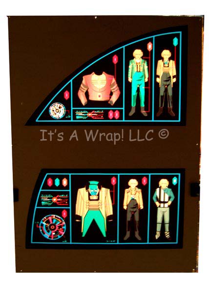 A Dominion themed computer interface panel appearing variously in episodes of Star Trek: Deep Space Nine. The item is a trapezoid shaped sheet of smoked acrylic with a multi-colored graphical application applied to the reverse that is best viewed when back lit by an external light source. The graphic depicts … |