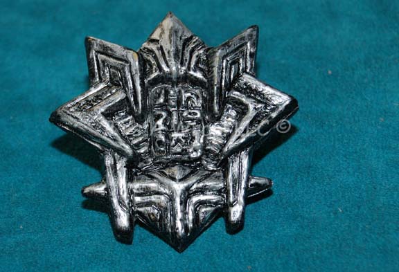 A molded resin badge appearing in the Star Trek: Deep Space Nine episode “Inter Arma Enim Silent Leges” for wear by members of the Romulan Continuing Committee. The item appears rather like a star clustered badge with a series of Romulan iconographic lettering centered, the item is black with metallic … |