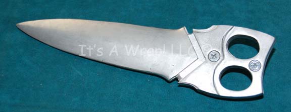 A prop bayonet like those appearing in the Star Trek: Deep Space Nine episode “Rocks and Shoals”. The item is a sturdy molded rubber ‘blade’ with a pair of finger holes in the end and a set of metal clip mounts housed in between. The item is painted metallic silver … |