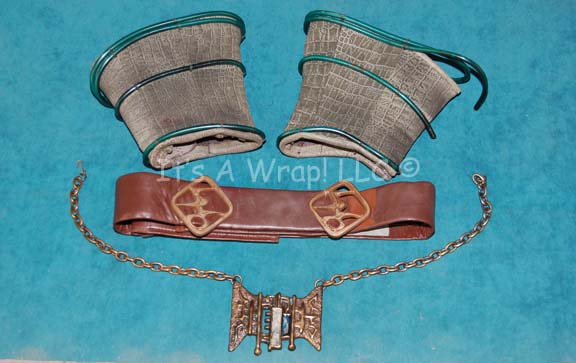 A lot of costume elements featured in the Star Trek: Deep Space Nine episode “Bloodoath” for wear by Michael Ansara reprising his role as the legendary Klingon captain “Kang”. The items are a pair of gauntlets, a belt, and a heavy duty metal necklace. The gauntlets are green hued faux … |