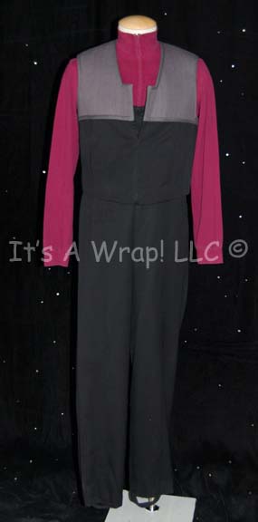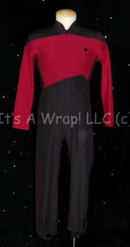 A costume similar to those featured in various episodes of Star Trek: The Next Generation from the third season on and earlier episodes of Star Trek: Deep Space Nine. This costume is a Starfleet uniform jumpsuit featuring black shoulders, a Command Red chest, back, sleeves, and piping around the Mandarin … |