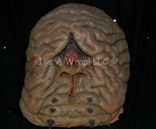 A special effects make-up mask created for various episodes of Star Trek: Deep Space Nine. The item is a sturdy molded foam rubber mask with a Velcro strap around the back that fastens the wearer’s face firmly into position. The item resembles a heavily wrinkled fatty face with black spines … |