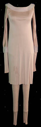 A costume featured in the Star Trek: Deep Space Nine episode “A Simple Investigation” for wear by “Arissa” (Dey Young), an alien detective attempting to infiltrate the nefarious Orion Syndicate whose presence on “Deep Space Nine” led to a brief romance with “Odo” (Rene Auberjonois). The costume is a lavender … |