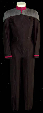 A full length black jumpsuit with red shoulders that zips up the spine and clasps at the top, open topped pockets on both thighs, black elastic stirrups at the feet, a black waist belt, and a Velcro patch for a Starfleet combadge (sold separately). Interior tags indicate use by various … |