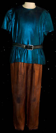 A child's costume featured in the Star Trek: Enterprise episode “Cold Station 12” for wear by a child aged Augment. The costume is copper colored trousers and an iridescent blue colored short sleeved shirt with a woven leather belt. The sewn in Enterprise tag reads ‘Chandler Tayor’. |